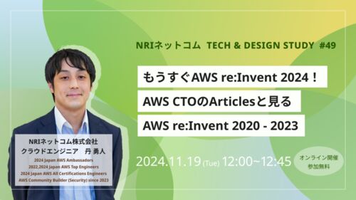 こんにちは、ブログ運営担当の小野です。 11/19(火)12:00~12:45 当社主催の勉強会「NRIネットコム TECH & DESIGN STUDY #49」が開催されます!! もうすぐ AWS re:Invent 2024 です。 AWS re:Invent 2024 に現地参加する方も、オンラインでLive Streamを視聴…