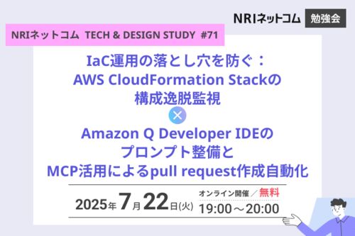 こんにちは、ブログ運営担当の海野です。 7/22(火)19:00~20:00 当社主催の勉強会「NRIネットコム TECH & DESIGN STUDY #71」が開催されます!! 今回のTECH & DESIGN STUDYでは、当社エンジニアから「IaC運用の落とし穴を防ぐ:AWS CloudFormation Stackの…