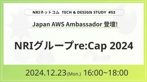 こんにちは、ブログ運営担当の海野です。 12/23(月)16:00~18:00 当社主催の勉強会「NRIネットコム TECH & DESIGN STUDY #53」が開催されます!! 12月上旬に開催されたAWS最大のカンファレンスであるre:Invent。今年も当社社員を開催地ラスベガスへ派遣して…