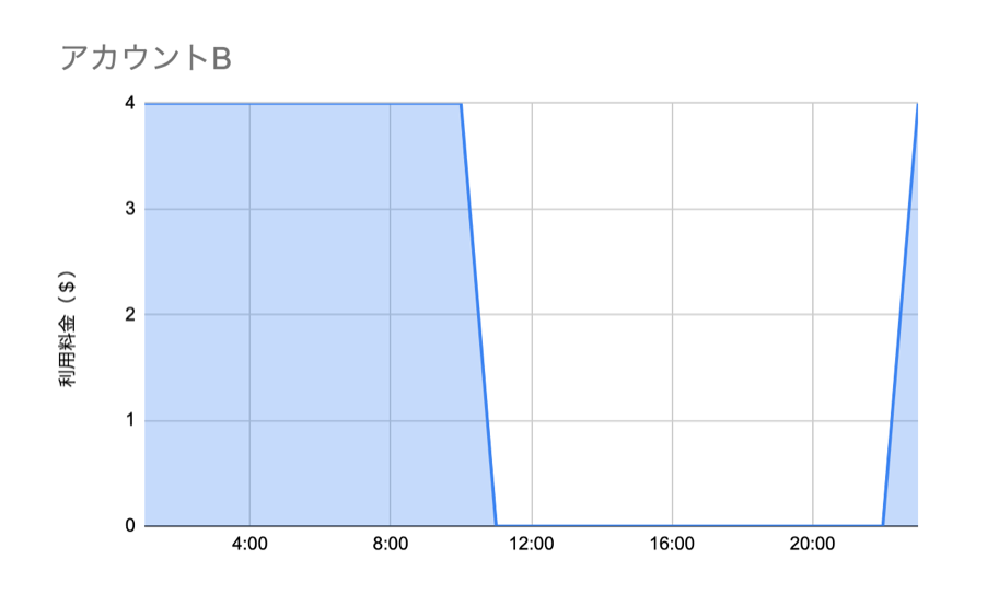 次の例は、夜間にバッチ用のAWSアカウント(アカウントB)です。夜間に一定の利用があるものの、稼働していない時間が多くSPの適用が不向きです。