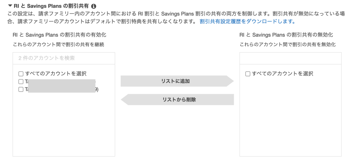 こういった場合に有用なのが、個別のアカウントでのSP購入ではなく、Organization全体でのSP購入です。アカウント設定の請求設定で、『RIとSavings Plansの割引共有』を設定しておくとOrganizations内のアカウント間で割引が共有されます。