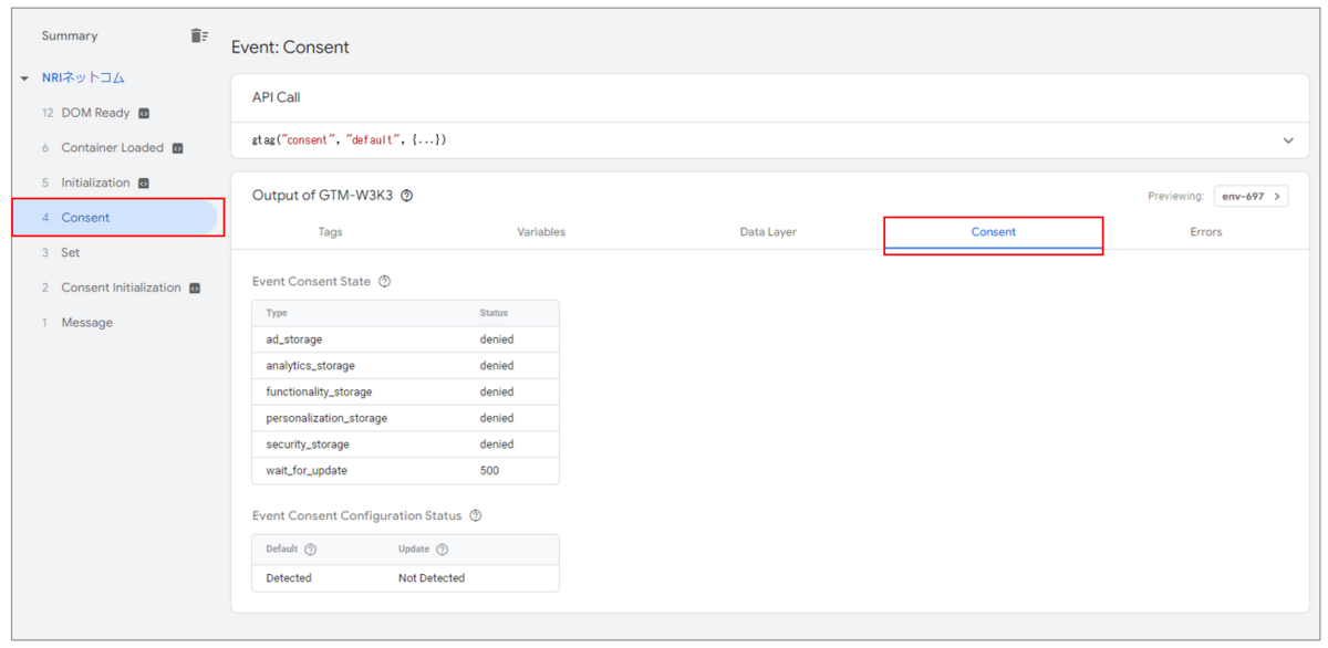 意図したタイミングで同意ステータスが更新されているかを確認する際は、GTMのデバッグ画面で「Consent」というイベントが発生しているかを確認します。