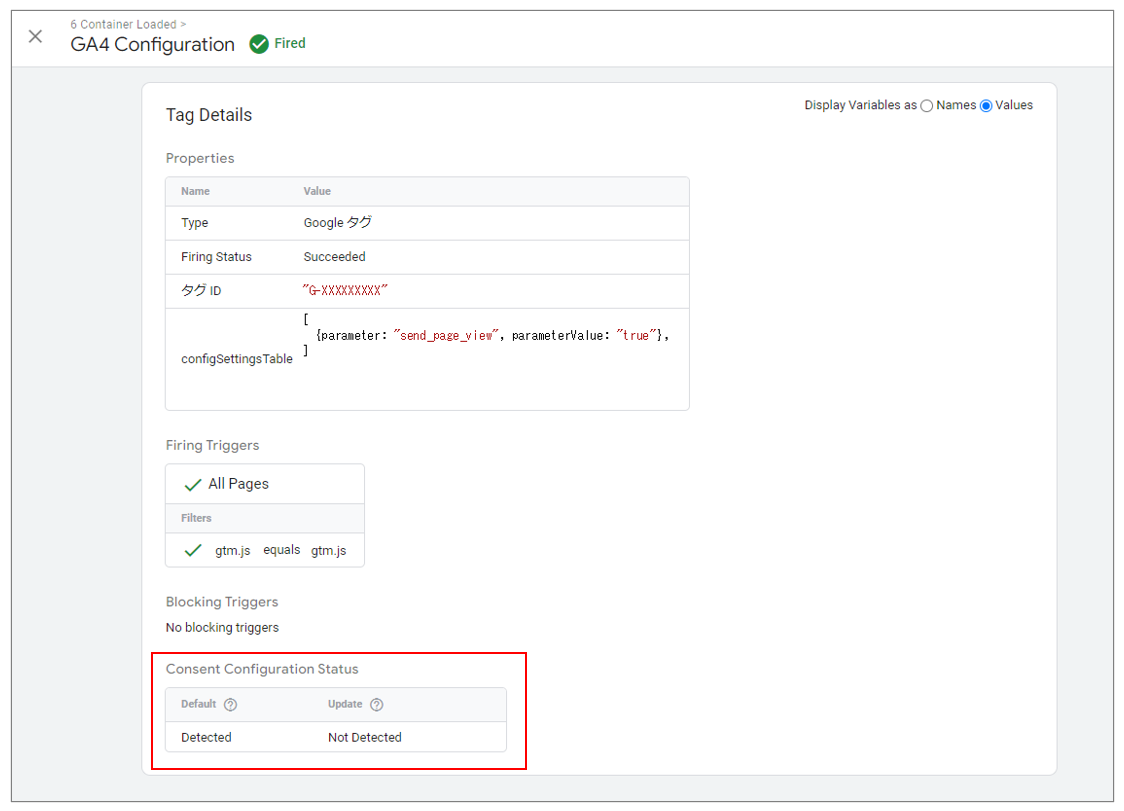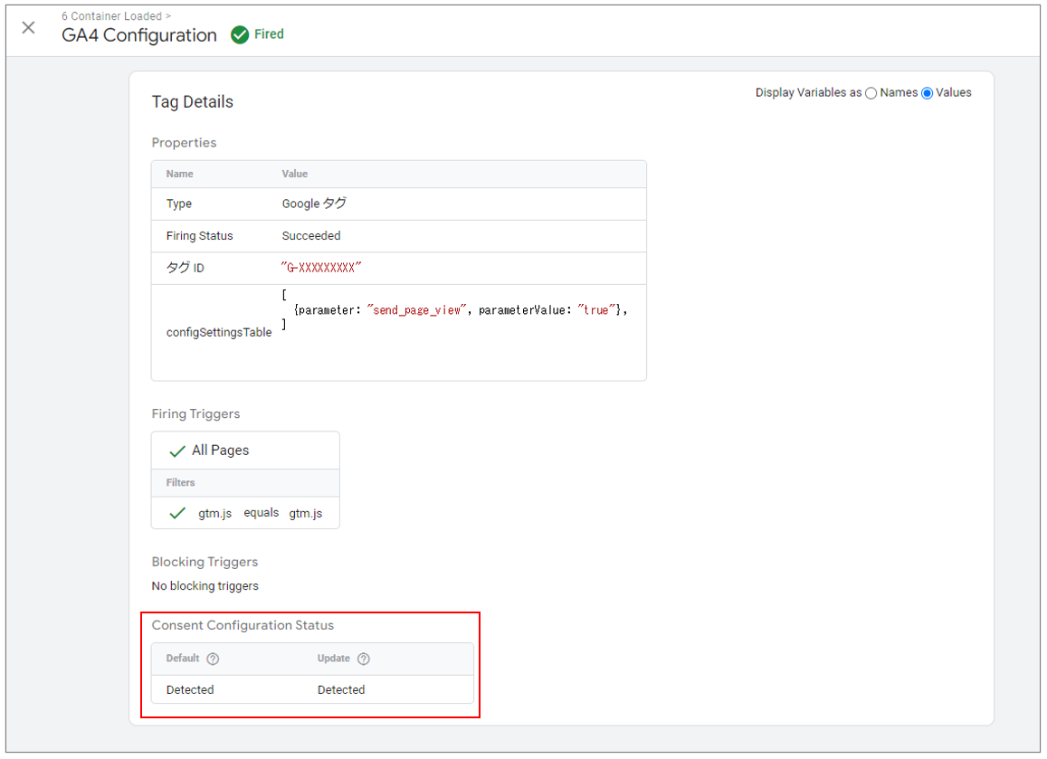 同意後に発火したGoogle タグを確認しても、「Event Consent Configuration Status」でUpdateが「Detected」となります。