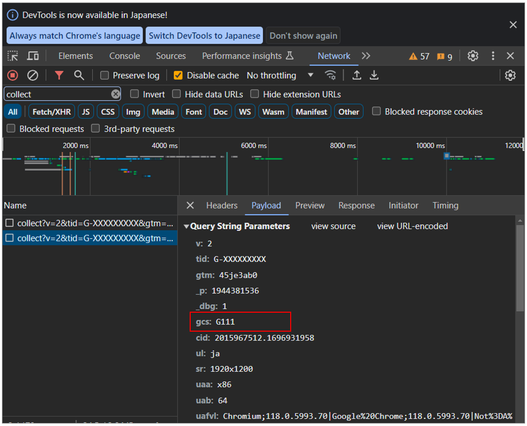例えば、Chromeの検証ツールからad_storage と analytics_storageに同意した後のGAの計測データを見てみると、パラメータ「gcs」の値がG111となることが確認できます。