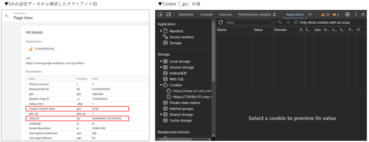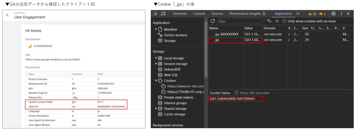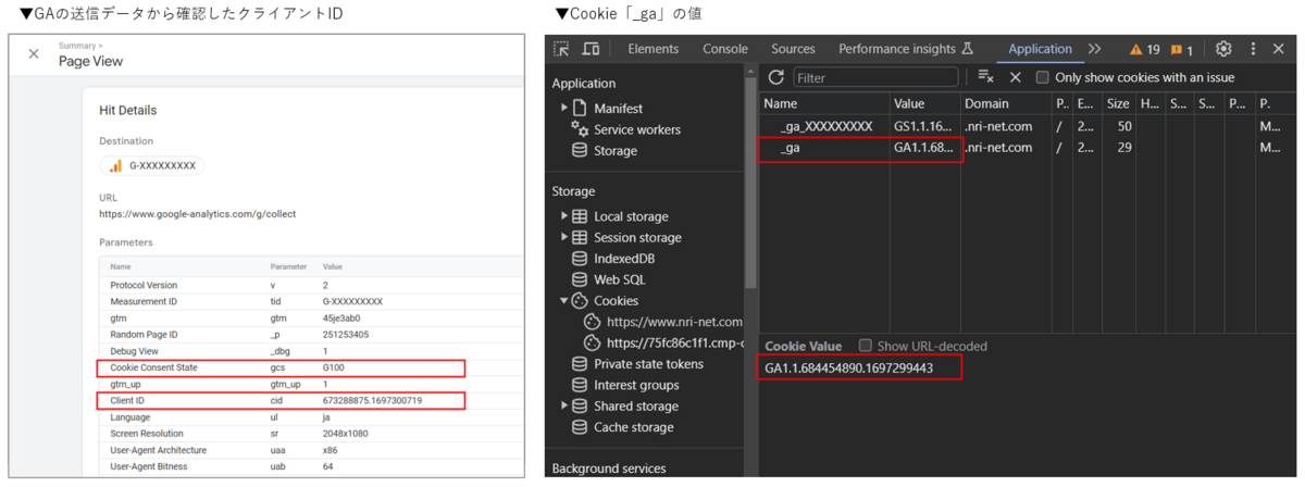 - 同意後は同意前のクライアントIDがそのまま引き継がれ、Cookie「_ga」の値はGAに送信されるクライアントIDと同じになる。