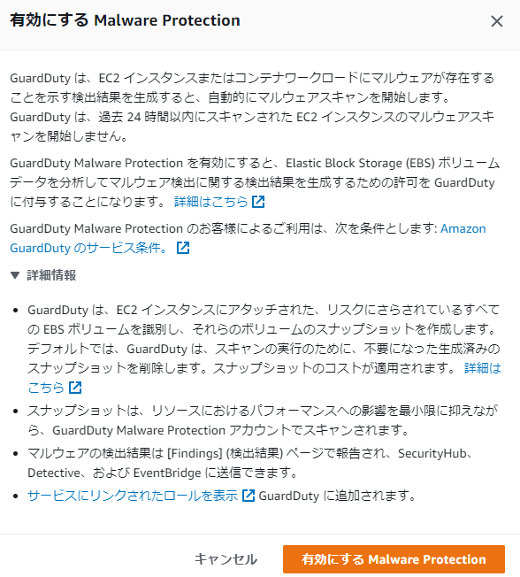 通常GuardDutyがマルウェア検知した際に取得したスナップショットは削除されますが、それを保持する設定ができます。有効にするとマルウェアを検出した場合にのみ保持されます。