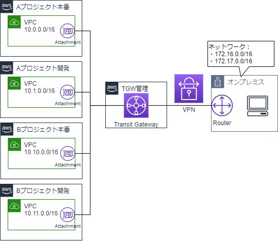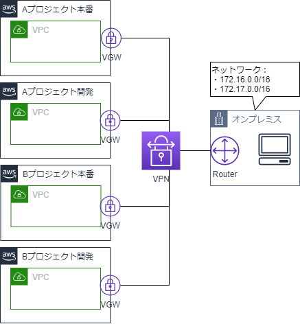 複数のAWSアカウント(VPC)とオンプレミス環境(社内NWなど)をVPN接続する場合を考えます。Direct Connectの場合もあります。