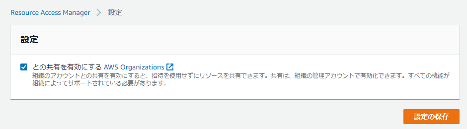 ※組織またはOUに対して共有する場合は、事前にRAM→設定でOrganizationsの設定を有効にする必要があります。(画面の日本語がちょっと変ですね)