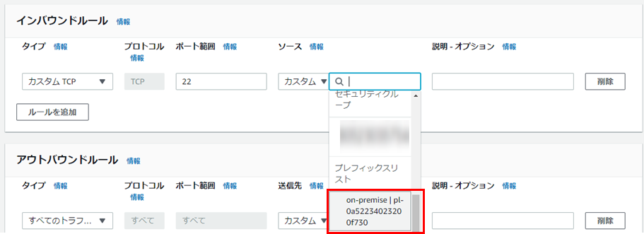セキュリティグループのルール作成時に、マネジメントアカウントで作成したプレフィックスリストが選べるようになっています。