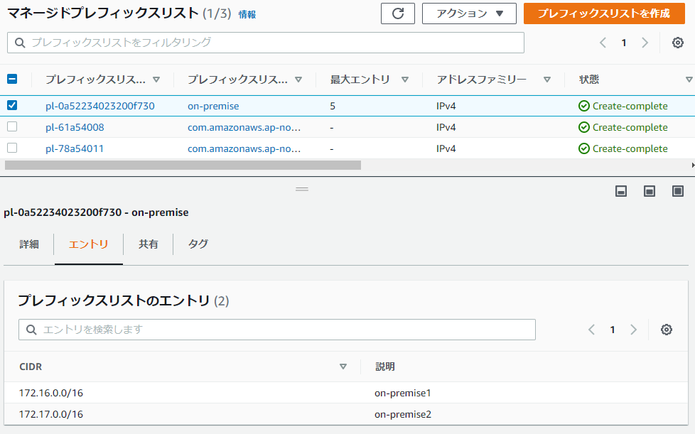 プレフィックスに登録されているCIDR情報は、共有されたアカウント側も、プレフィックスリストの一覧から選択して確認できます。(もちろん共有された側では変更できません)