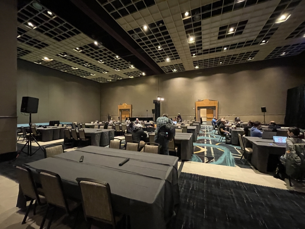 ランチ会場。こちらはMGM Grand Hotelのランチ会場です。広い(2度目) 朝昼は提供があり、食事をいただけます。ビュッフェとGrab(テイクアウトみたいに持ち運べるやつ)があるようです。日にち・会場によっては、味噌汁がいただけるとか...?