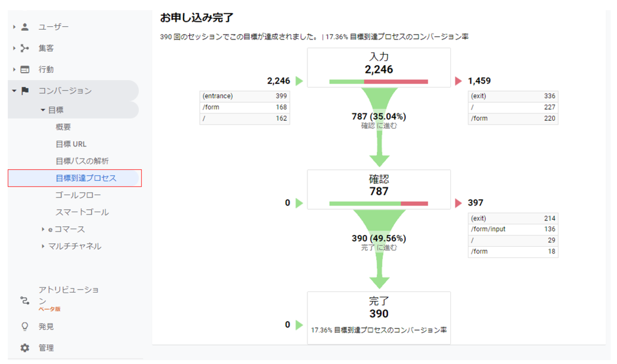以下は申込み完了までのプロセスを設定した例です。ただ申込み完了ページへの到達数を確認できるだけでなく、導線上のどの部分がボトルネックになっているかを分析しやすいとても便利な機能ですよね。