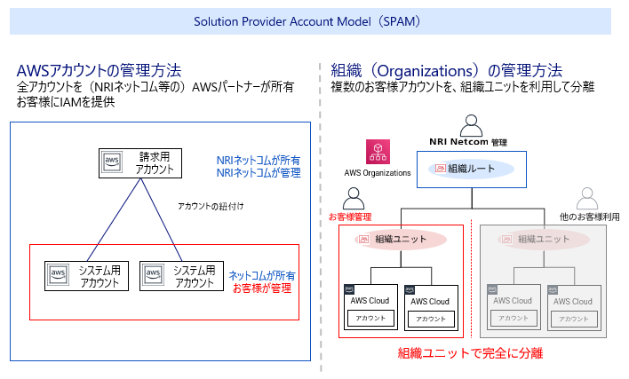 SPAMの場合は、マネジメントアカウントの管理が全てAWSパートナーとなるため、お客様はAWS Organizationsの機能やAWS Control Towerをお客様自身で管理することはできません。